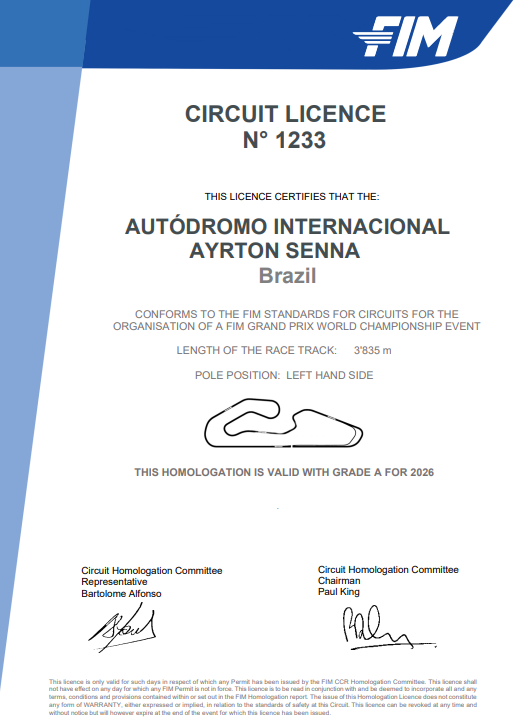A nova pista do Autódromo Internacional de Goiânia Ayrton Senna está homologada para competições pela Federação Internacional de Motociclismo (FIM). A chancela foi oficializada na noite desta quinta-feira, (19/3). O circuito foi avaliado durante evento-teste, que foi realizado nos dias 28 de fevereiro e 1° de março, envolvendo várias categorias do motociclismo e deu sinal verde para a disputa do Grande Prêmio de Goiás MotoGP 2026.