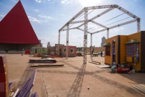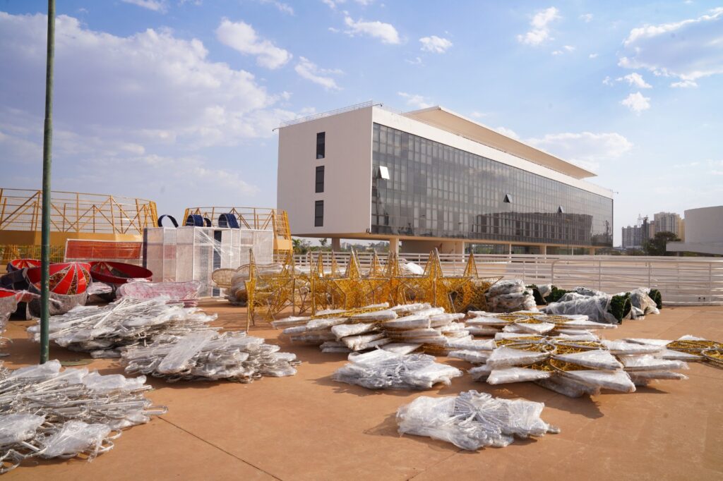 Material decorativo começa a chegar no Centro Cultural Oscar Niemeyer para montagem do Natal do Bem 2025. Fotos: Nandra Leão