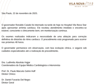 O governador permanece em observação, com boa evolução clínica, e seguirá sob cuidados especializados até a realização do procedimento.