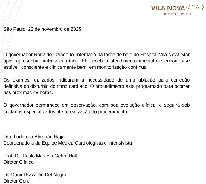Estados / Goiás / Nota a Imprensa: Governador Ronaldo Caiado foi internado na tarde de hoje no Hospital Vila Nova Star, após apresentar arritmia cardíaca