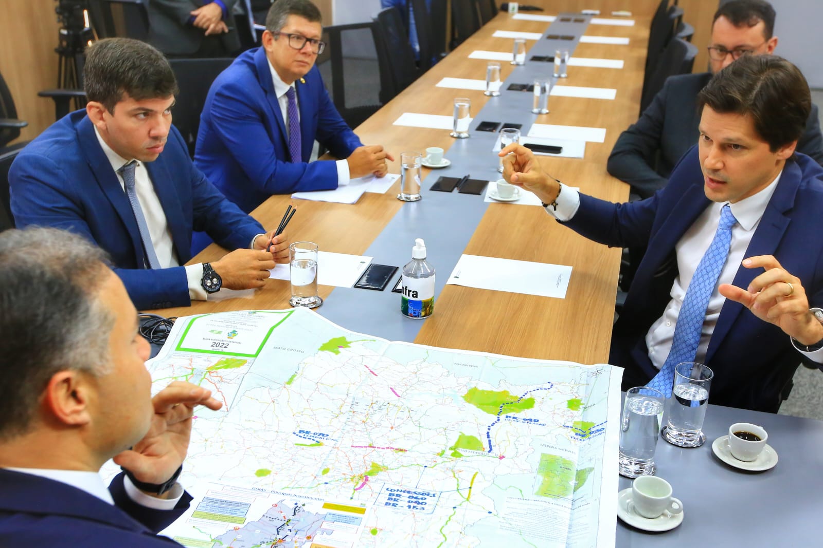 Acompanhado de Pedro Sales (Agehab) e Lucas Vissotto (Goinfra), ele apresentou ao ministro Renan Filho demandas prioritárias elencadas pelo governador Ronaldo Caiado
