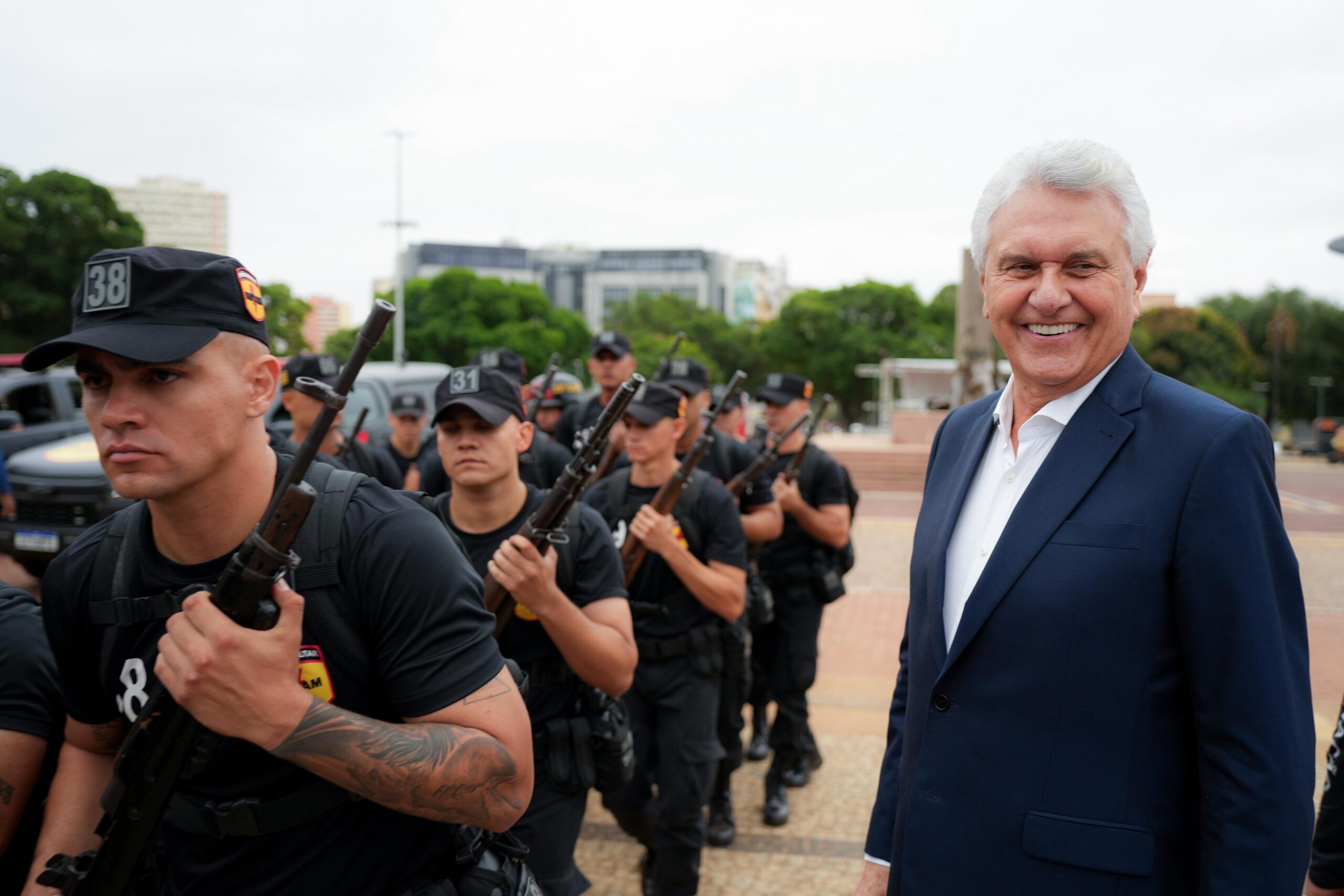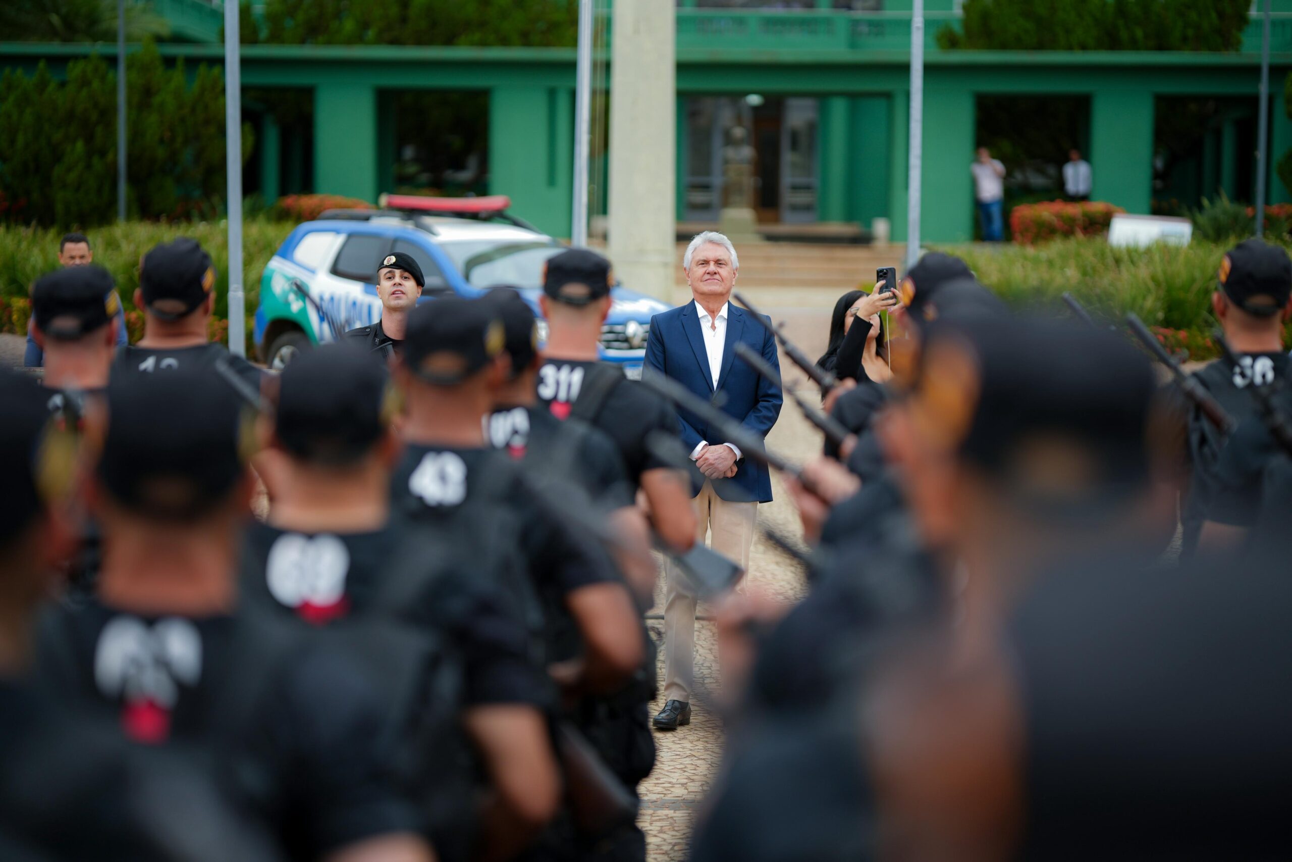 O governador Ronaldo Caiado recebeu, neste sábado (9/8), na Praça Cívica, em Goiânia, os integrantes do 22º Curso Operacional de Rotam (COR) e reforçou a postura do Governo de Goiás contra a criminalidade. “O Estado de Goiás não admite bandido achar que pode ter comando no território goiano. E, graças a vocês, nós atingimos hoje o melhor resultado no país”, afirmou ao reconhecer a alta especialização da tropa goiana.