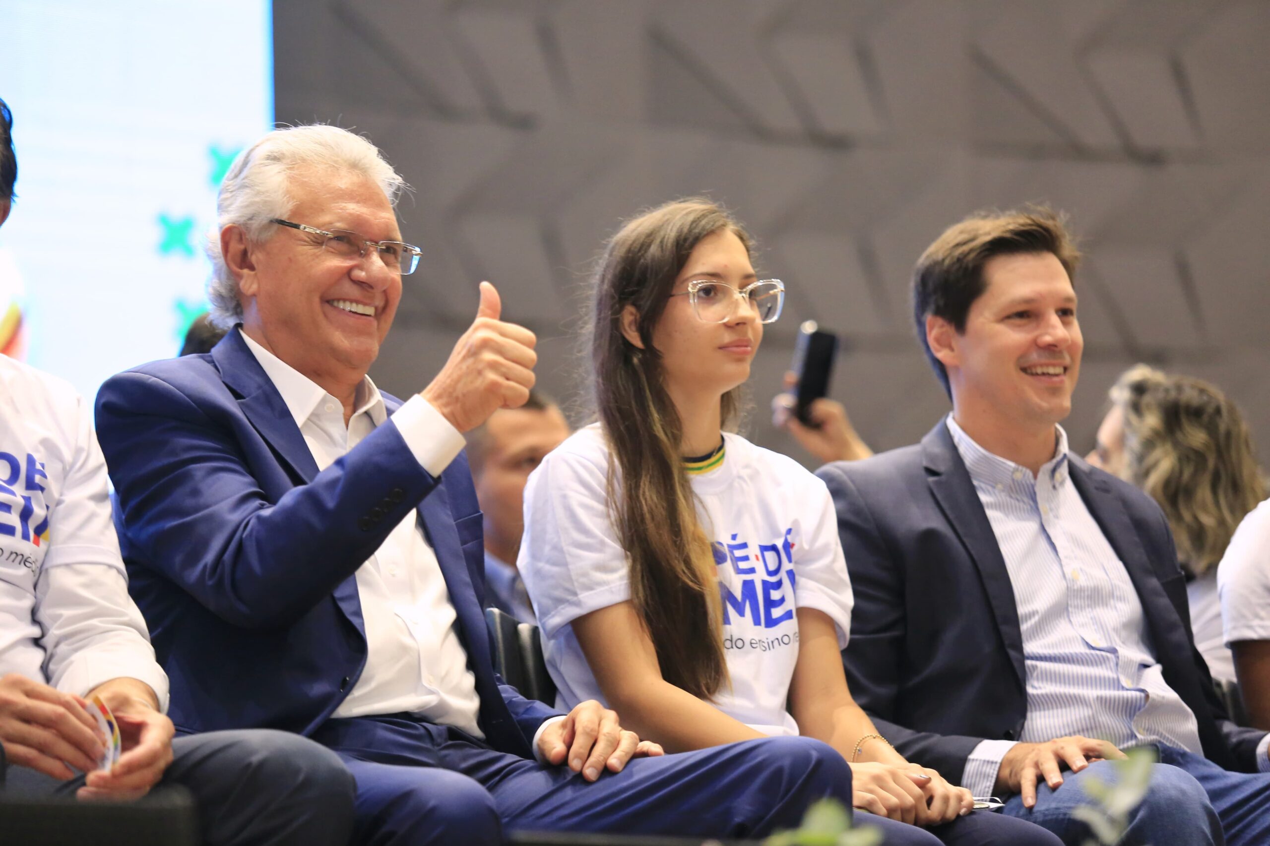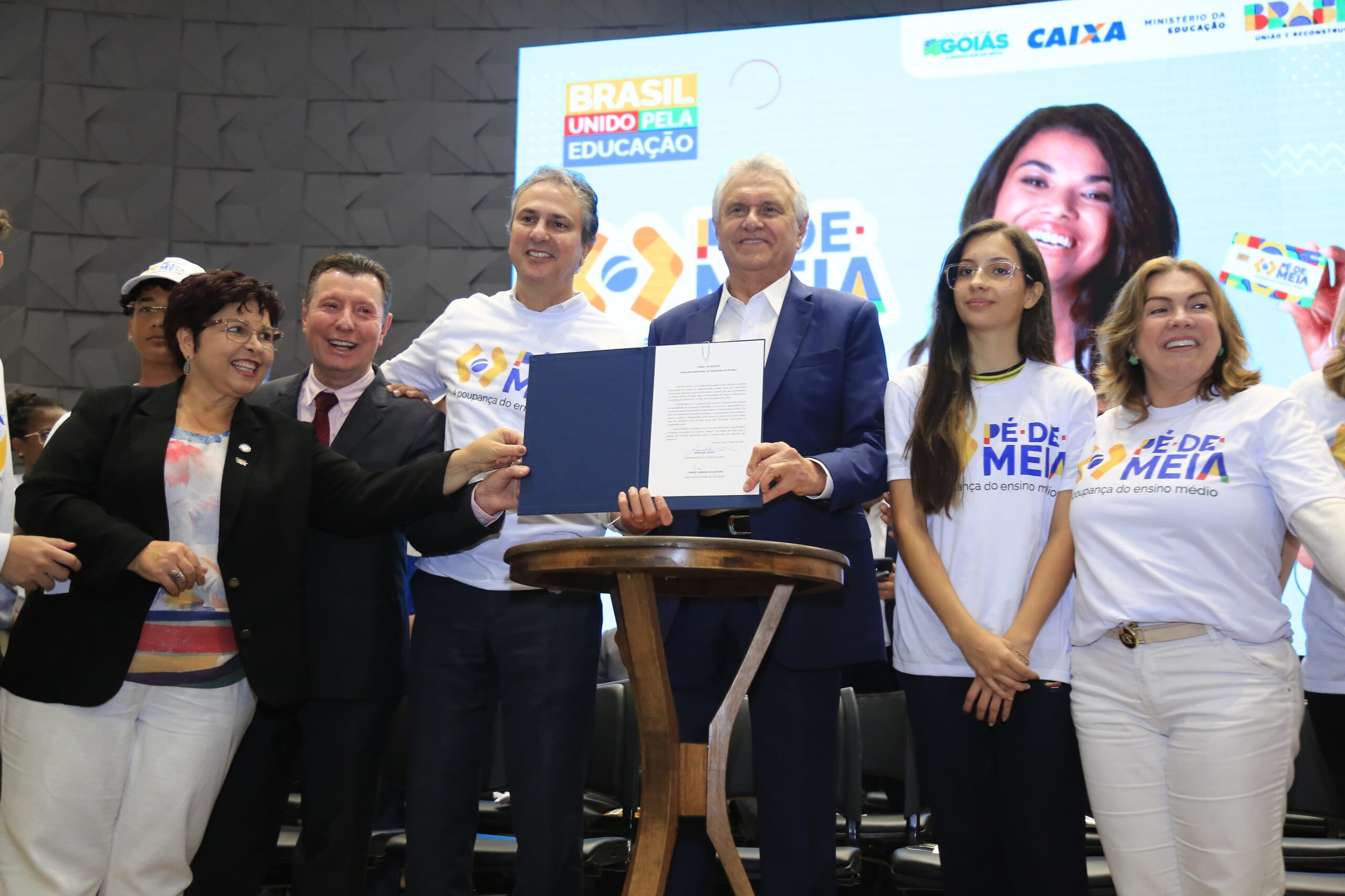 Ronaldo Caiado, Camilo Santana e demais autoridades no lançamento do programa Pé-de-Meia em Goiás: incentivo para conclusão do ensino médio
