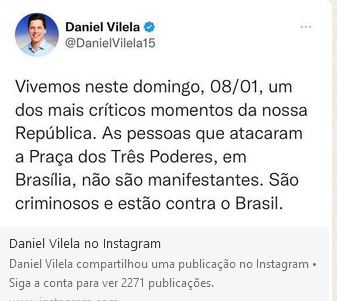 O vice-governador de Goiás Daniel Vilela, em suas redes sociais condenou os ataques a República.