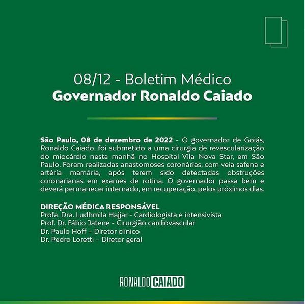 O governador Ronaldo Caiado foi submetido a uma cirurgia no coração na manhã de hoje no hospital Vila Nova Star, em São Paulo.