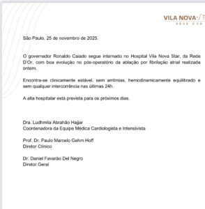 De acordo com o boletim, Caiado apresentou boa evolução clínica após a ablação para tratamento de fibrilação atrial, realizada na segunda-feira (24). O hospital informou que o governador está “clinicamente estável, sem arritmias, hemodinamicamente equilibrado e sem qualquer intercorrência nas últimas 24 horas”.
