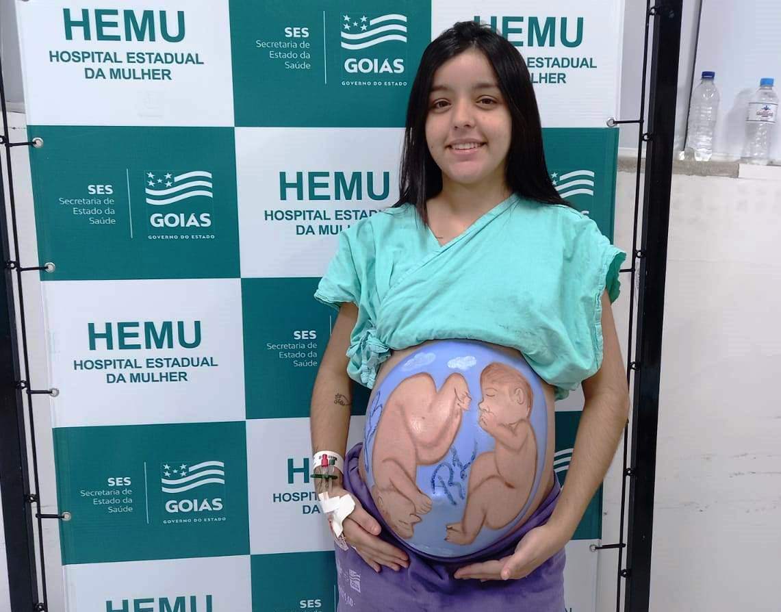 A gestante Emelly Kelly grávida de gêmeos amou a pintura gestacional