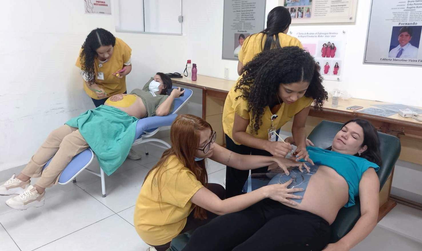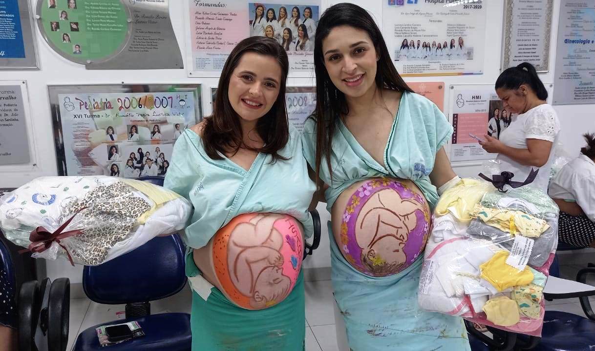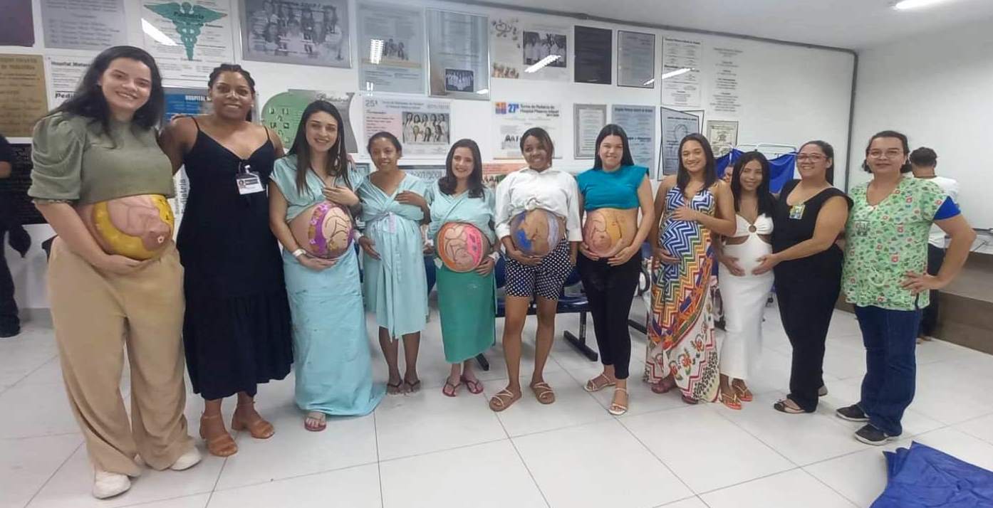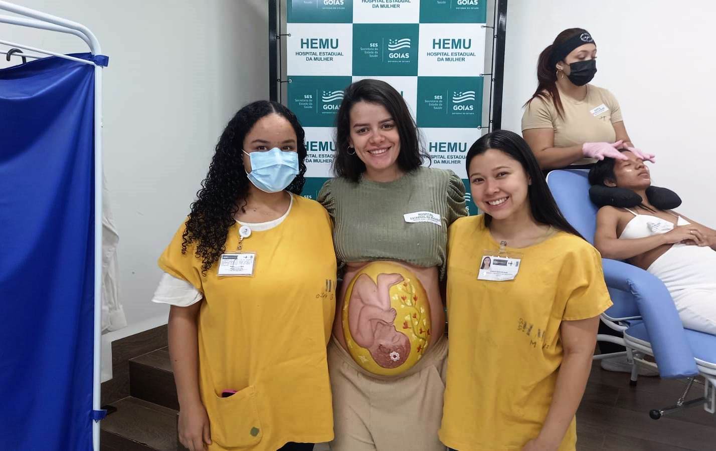 Residentes de enfermagem obstétrica realizam a pintura gestacional, onde a barriga da gestante se transforma em uma verdadeira obra de arte