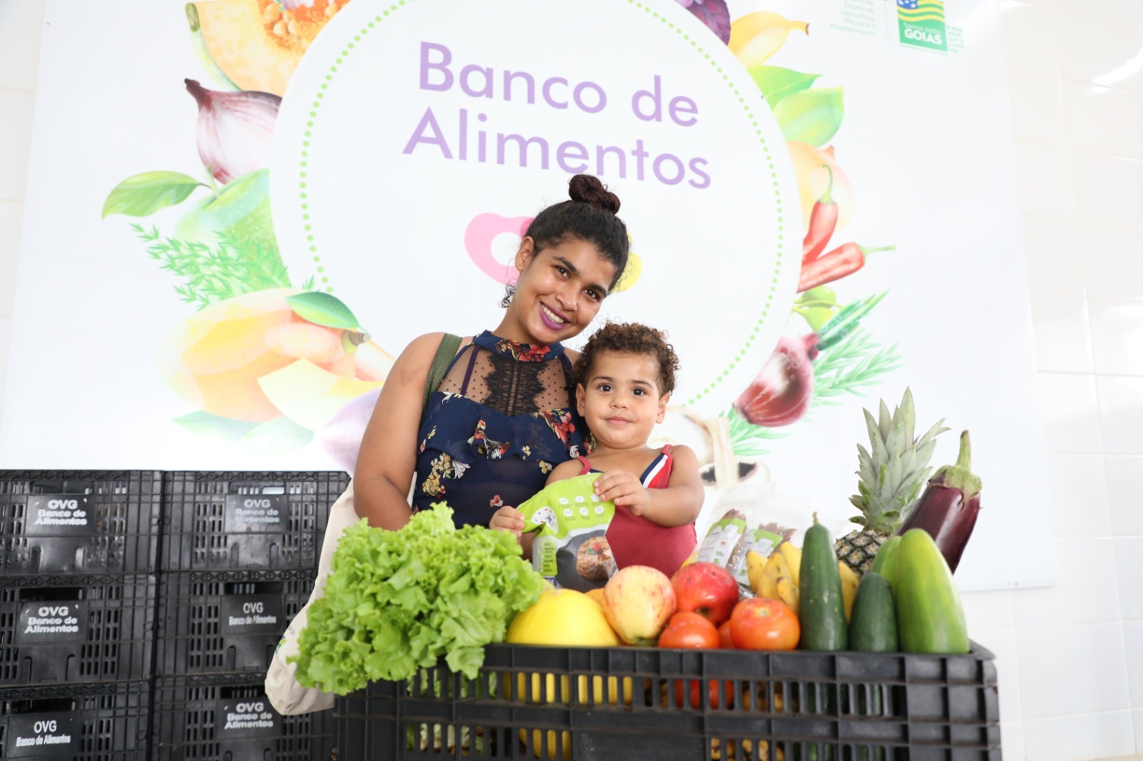 Com pacotes do Mix do Bem em mãos e entre frutas, legumes e verduras in natura, Joice Fernanda Ferreira de Oliveira, 27 anos, comemora os benefícios recebidos do Goiás Social