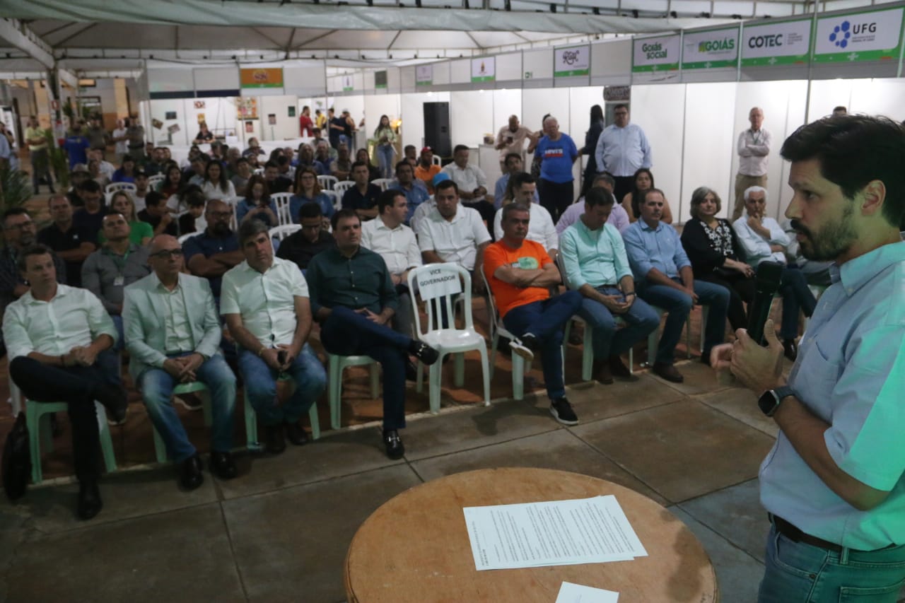 Daniel Vilela fala para participantes de feira em Silvânia sobre investimentos do Governo de Goiás em infraestrutura que ajudam a desenvolver a região. Fotos: Jota Eurípedes
