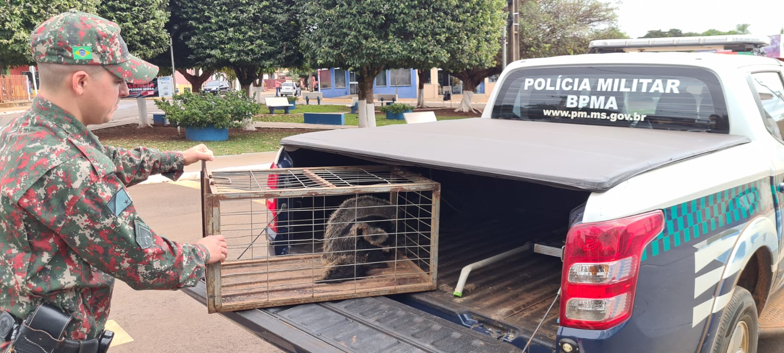 A Polícia Militar de Paraíso das Águas, município de Mato Grosso do Sul, realizou o resgate de um filhote de Tamanduá Bandeira.