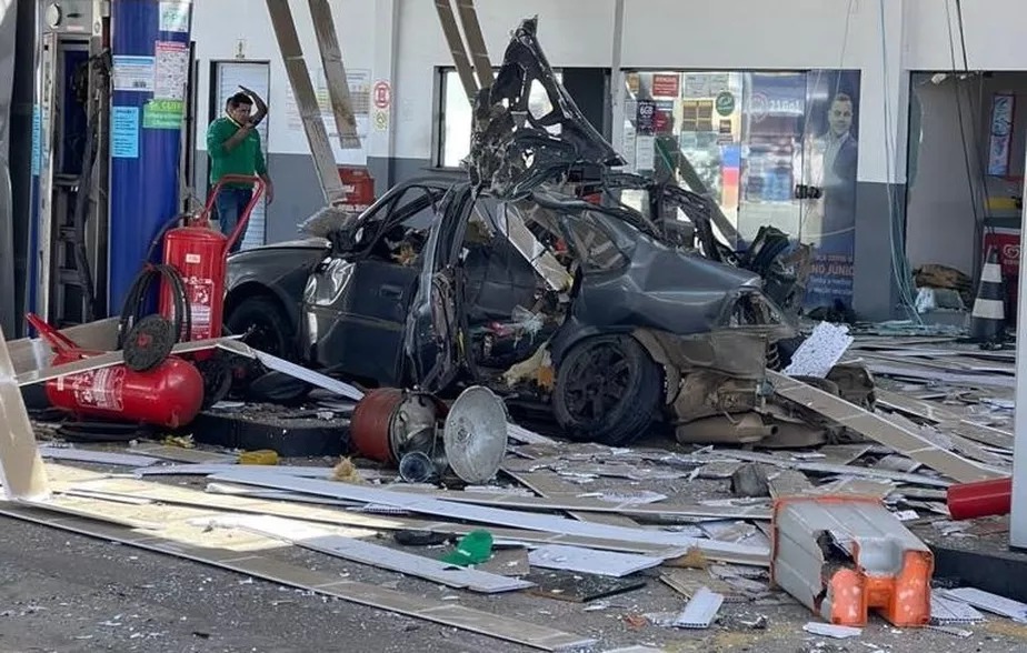 Carro ficou completamente destruído e a estrutura do posto de combustível foi abalada | Foto: Divulgação