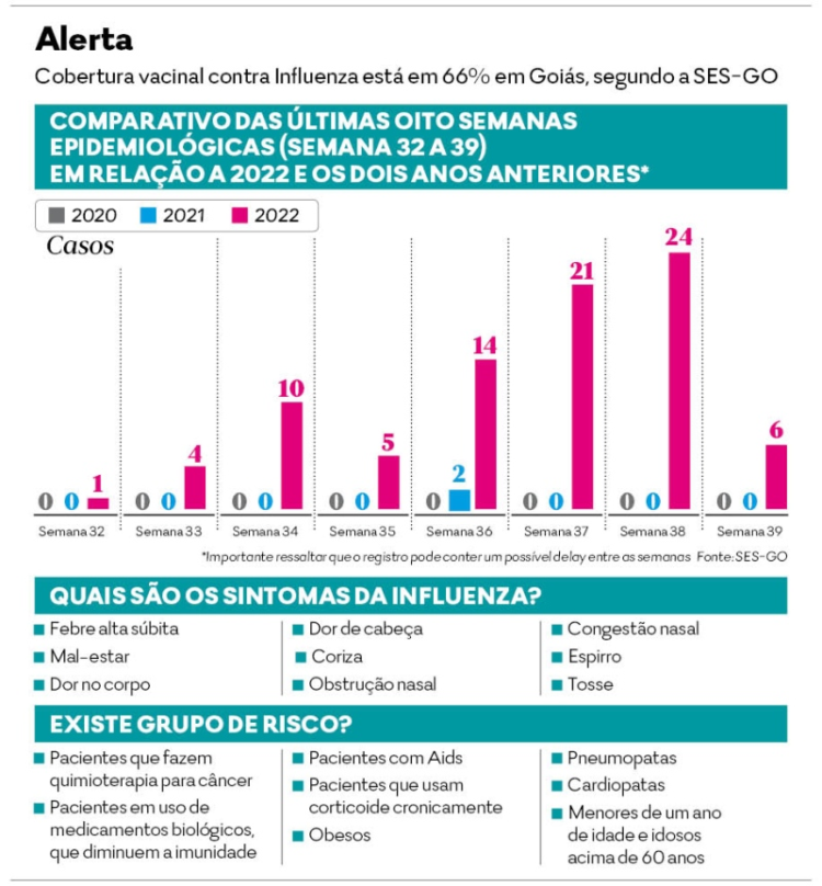 Um em cada quatro casos de 2022 ocorreu em setembro e outubro. Já em um período das últimas oito semanas epidemiológicas em Goiás (veja quadro), a influenza teve 85 casos. As faixas etárias mais afetadas são: acima de 60 anos, abaixo de 4 anos. Enquanto no mesmo recorte de 2021, apenas duas pessoas foram infectadas.