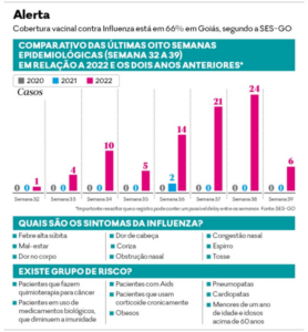 O surgimento de casos de influenza fora de época em Goiás, provoca alerta na saúde. Normalmente manifestada no inverno, entre maio e julho, a gripe chegou a um número de infectados maior nos meses de agosto, setembro e começo de outubro deste ano, conforme dados da Secretaria de Estado de Saúde (SES-GO).
