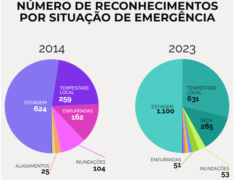 Já nos últimos dez anos, o número de reconhecimentos federais de emergências por desastres naturais no Brasil saltou de 1.189 para 2.197, segundo dados do Sistema Integrado de Informações sobre Desastres que consideram o período entre 2014 e 2023.