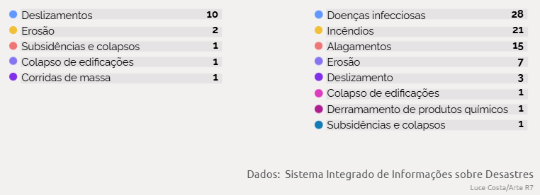 Durante o período, os desastres resultaram em 3.464 mortes e causaram prejuízos superiores a R$ 151 bilhões, sem considerar os impactos do desastre ocorrido no estado do Rio Grande do Sul em 2024. Neste último caso, as enchentes afetaram mais de 96% do estado e mataram ao menos 180 pessoas.