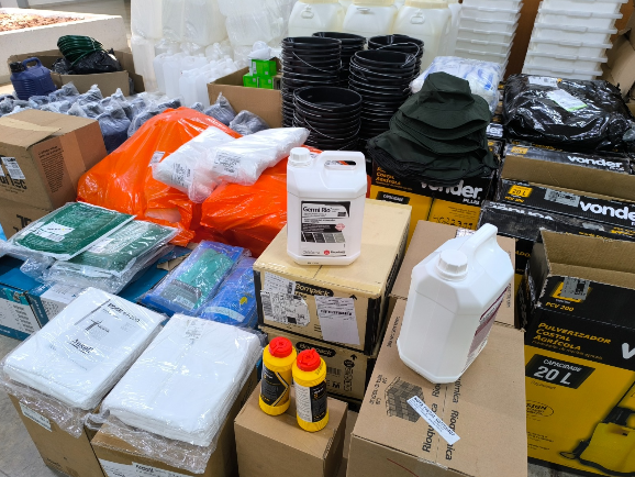 Entre os EPIs e insumos adquiridos estão máscaras de proteção facial, macacões, luvas, chapéus, aventais e botas plásticas; testes para o processo de esterilização a vapor saturado; baldes, escovas, caixas multiuso, caixas frigoríficas, bandejas, lavadoras de alta pressão, mangueiras, pulverizadores, reservatórios, bombonas, mesas, cadeiras, luminárias de emergência, garrafas térmicas e tendas.