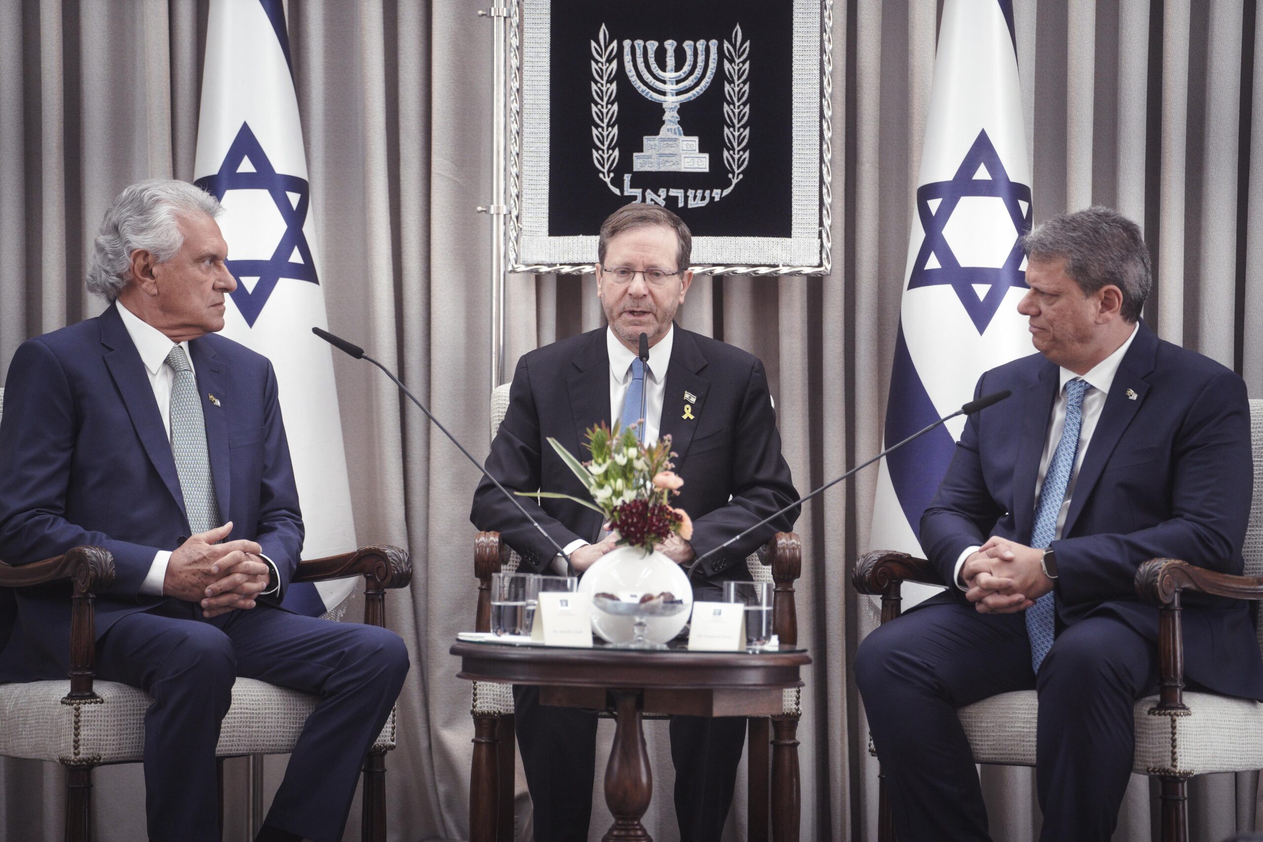 Caiado em encontro com o presidente de Israel, Isaac Herzog. O anfitrião agradeceu o apoio e a “demonstração de solidariedade”