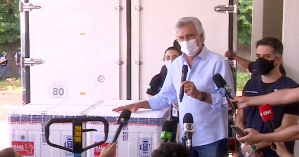 Goiânia (GO) – O governador de Goiás, Ronaldo Caiado (DEM), afirmou neste domingo (24/1) que a ocupação dos leitos de Unidade de Terapia Intensiva (UTI) está no “limite”, enquanto recebia 65,5 mil doses da vacina AstraZeneca/Oxford em Goiânia. O percentual de ocupação dos leitos de UTI chegou a 74,03% neste domingo, segundo dados da Secretaria Estadual de Saúde (SES). Para Caiado, este aumento acentuado nos últimos dias preocupa o governo. “Estamos naquele limite. A transmissibilidade [da Covid-19] tem sido alta. A letalidade tem mantido o percentual de 2% e também temos a preocupação com finais de semana e eventos. Não podemos ter uma oscilação para mais nesse quadro que estamos vivendo agora”, destacou o governador. Ronaldo Caiado pontuou que o governo pede, neste momento, “equilíbrio, moderação e conscientização” da população goiana. “O cidadão se conscientizou que pode ajudar a não ter um maior índice de contaminação? Então nos ajude. Com o tempo vamos vacinar todo mundo”, pondera. O estado acumula desde o início da pandemia 338.141 pessoas contaminadas pelo coronavírus e 7.286 mortes provocadas pela doença, segundo dados da SES divulgados neste domingo. Segundo a SES-GO, os lotes com as 65,5 mil doses da vacina estão sendo separados e organizados para serem distribuídos aos municípios. Segundo a pasta, “esta remessa é exclusivamente para vacinação de trabalhadores de saúde das instituições de saúde”.