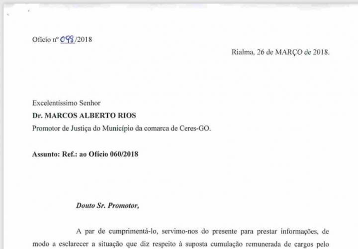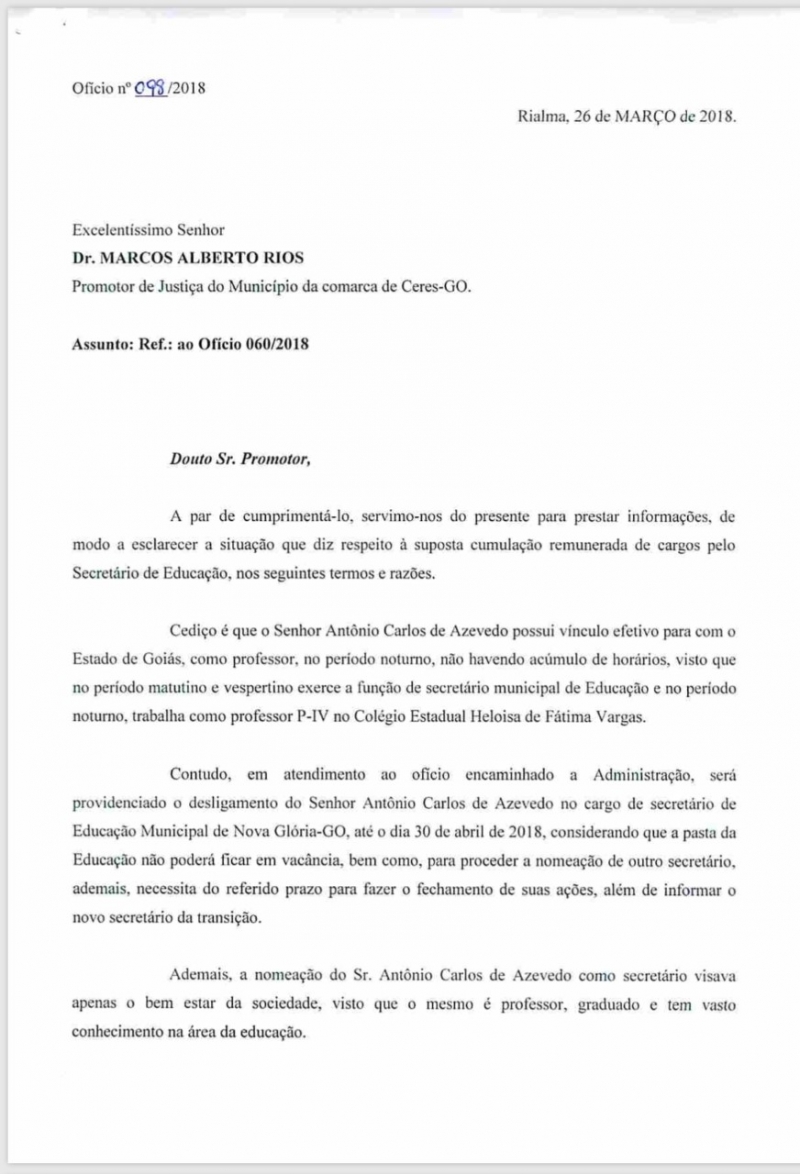 O Prefeito de Nova Glória Carlos Luiz de Oliveira, popularmente conhecido como Carlinho, comunicou em uma carta ao Promotor Marcos Rios que irá acatar sua determinação e irá afastar o Secretário de Educação Antônio Carlos de Azevedo. Na carta, o prefeito explica que não existia acúmulo de horários pois o secretário trabalhava como professor apenas no período noturno, mas que mesmo assim iria acatar a decisão do Promotor.