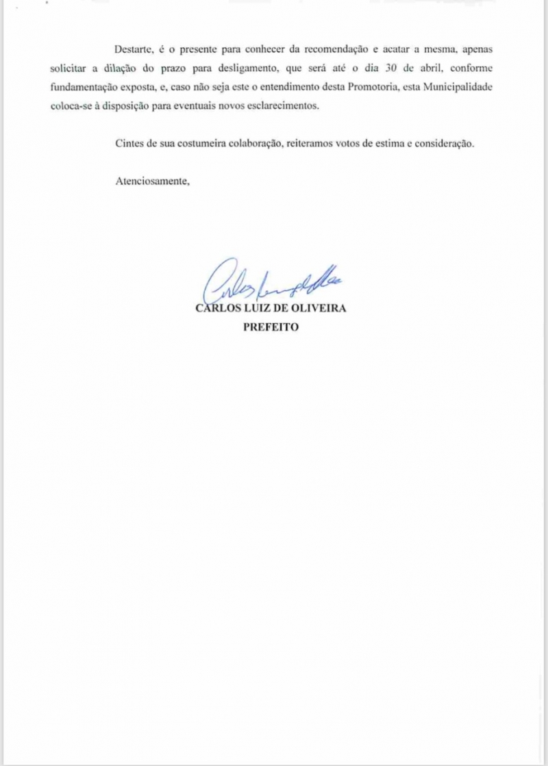 Ainda na carta o prefeito disse que até o prazo estabelecido (30/04) o secretário será afastado e irão nomear outra pessoa tão qualificada quanto para a pasta, afim de que a população são seja afetada. Esta é a segunda prefeitura que segue a recomendação do promotor e pelo andar da carruagem, muitas outras ainda vão seguir o mesmo caminho.