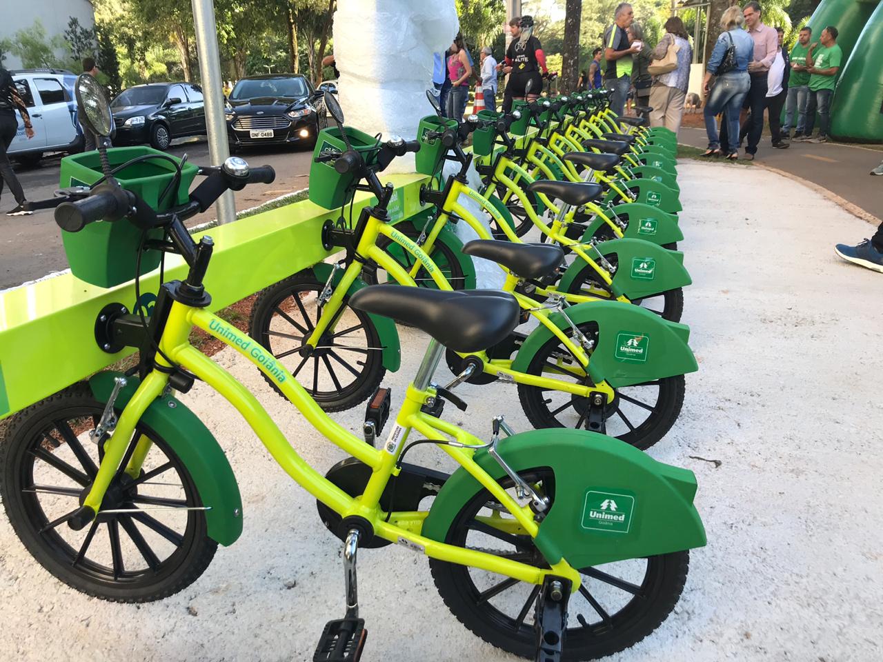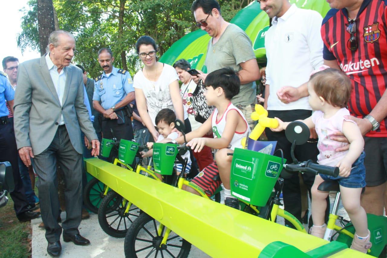 A solenidade, que reuniu auxiliares do prefeito, lideranças políticas e populares, também marcou o lançamento de outras duas estações, uma infantil, na Praça do Sol, e uma para adultos no Instituto Federal de Goiás. Patrocinado pela Unimed e operacionalizado pela Serttel, o projeto passa a contar com 200 bicicletas em 20 estações.