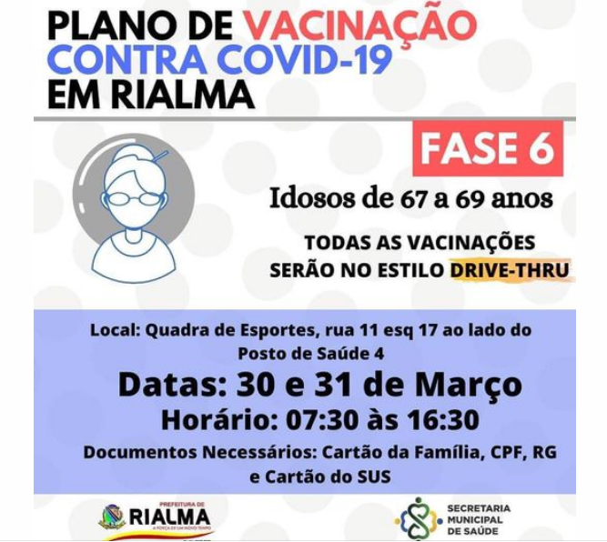 A Prefeitura Municipal de Rialma, por meio da Secretaria de Saúde, informa o Plano de Vacinação Contra COVID-19 no município (fase 6).