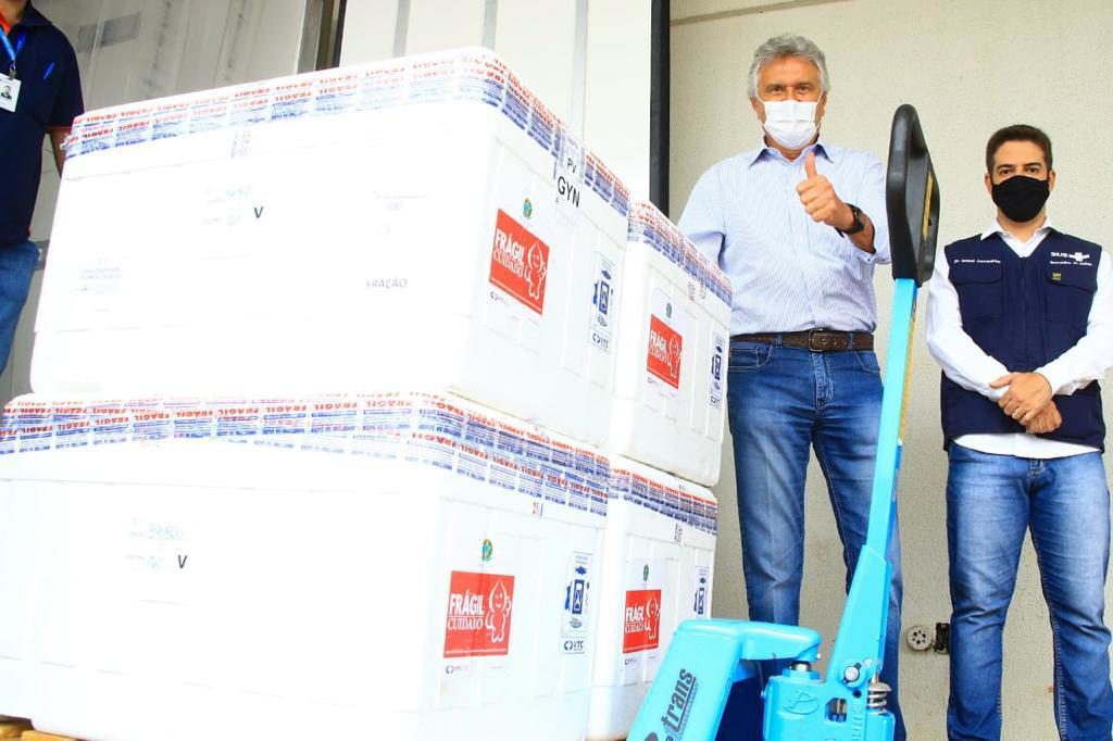 O governador do Estado de Goiás Ronaldo Ramos Caiado (DEM), acompanhado pelo secretário Estadual de Saúde, Ismael Alexandrino, recebeu neste domingo (07/02), a quarta remessa de vacinas contra a Covid-19, enviadas pelo Ministério da Saúde. São 77,8 mil novas doses da Coronavac, produzidas pelo laboratório chinês Sinovac em parceria com o Instituto Butantan, que vieram em um voo comercial. “Isto nos traz uma esperança enorme de atingir exatamente a faixa etária que tem o maior risco de complicações e o maior percentual de letalidade”, disse o governador, explicando que terão prioridade, inicialmente, idosos de 90 anos acima e depois 85 anos acima.