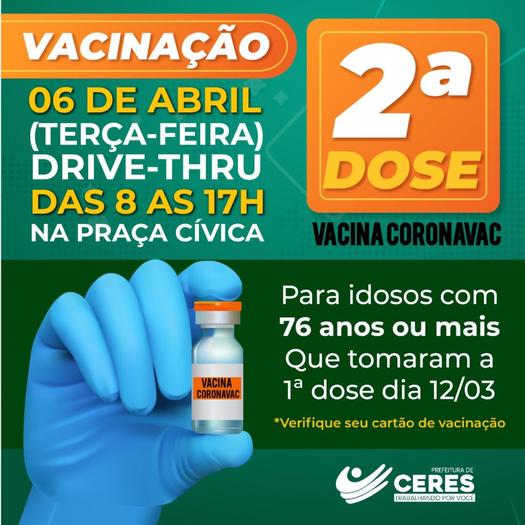 A Secretaria Municipal da Saúde de Ceres irá aplicar a segunda dose da vacina, em idosos com 76 anos, que tomaram a 1ª dose da vacina Coronavac no dia 12 de março. A vacinação será feita na modalidade drive-thru nesta terça-feira, dia 06 de Abril, das 8h às 17h, na Praça Cívica, em frente à Prefeitura.